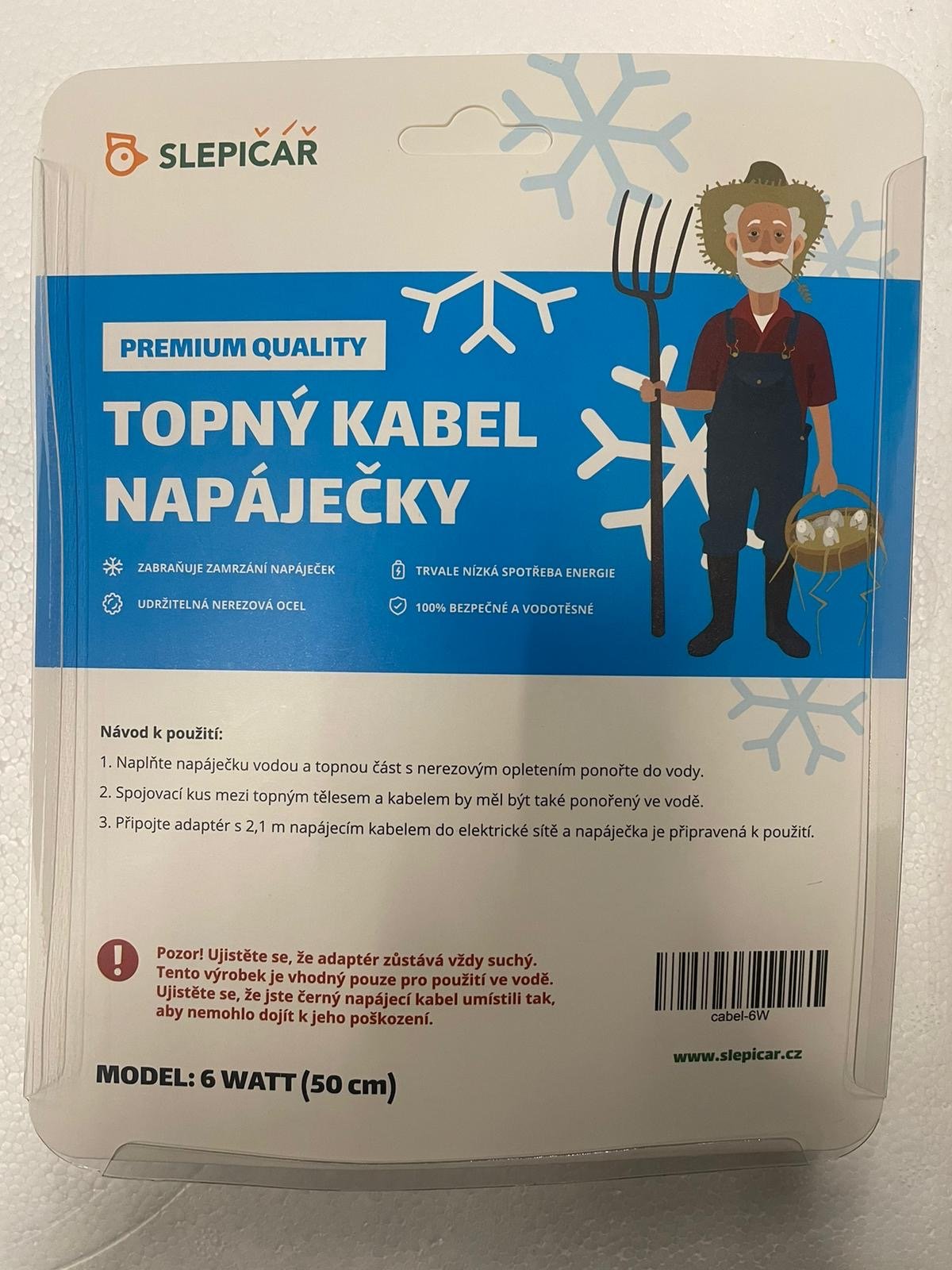 Topný kabel proti zamrzání vody v napáječkách, s nerezovým opletením topného tělesa, kabelem dlouhým 50cm, s adaptérem 12V a výkonem 6W. Pokud hledáte řešení pro zamrzající vodu v napáječkách, máme pro Vás praktický topný kabel, který je určený přímo do vody. Tento praktický kabel je vhodný do všech druhů napáječek od plastových až po kovové. Topná část kabelu je pokrytá nerezovým opletením, které je nejenom pružné a flexibilní, takže se dá kabel tvarovat, ale také nekoroduje, a proto může být ponořeno ve vodě celou zimní sezónu.