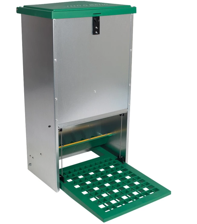 Při použití krmítka Feed-o-matic je potrava přístupná pouze tehdy, když kuřice stojí na stupátku. Myši, krysy a ptáci se nedostanou na potravu a proto nemohou kontaminovat zrní. Feedomatic chrání drůbež před nebezpečnými chorobami. Nášlapné krmítko je stabilní, snadno se čistí a je odolné proti stříkající vodě.