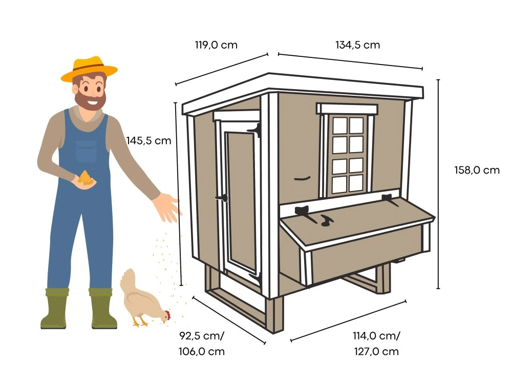 Kurník váží 140 kg a po smontování má rozměry 1,27 m x 1,33 m x 1,58 m (D x Š x V) - vč. hnízdních boxů