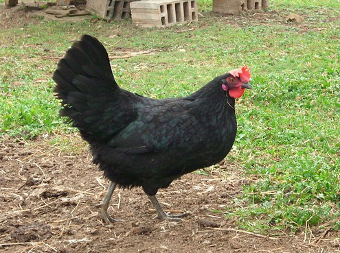 Krásná tmavá slepice. Její černé peří zdobí modrozelené odlesky a hrudník má posetý hnědozlatými pírky.