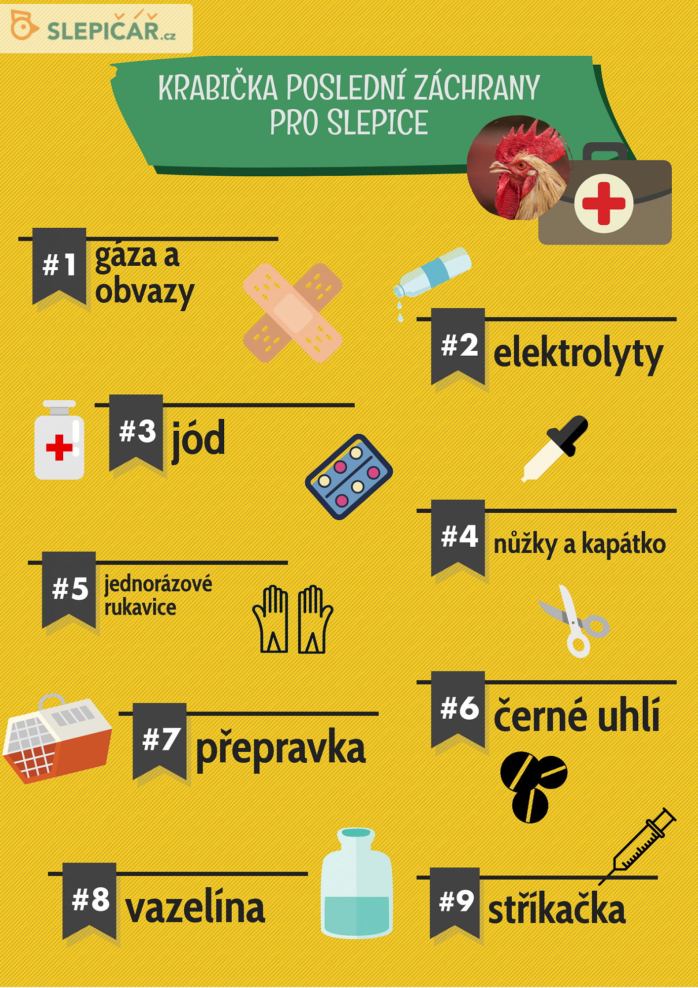Přidáno na náš blog 8. 10. 2018Přesto, že slepice můžeme označit za vytrvalé zvíře, které vydrží ledacos, občas může nastat situace, kdy bude potřeba sáhnout po lékárničce a slípku na dvorku ošetřit. Jaké jsou základní věci, které by krabička měla obsahovat se můžete dozvědět v dnešním příspěvku.